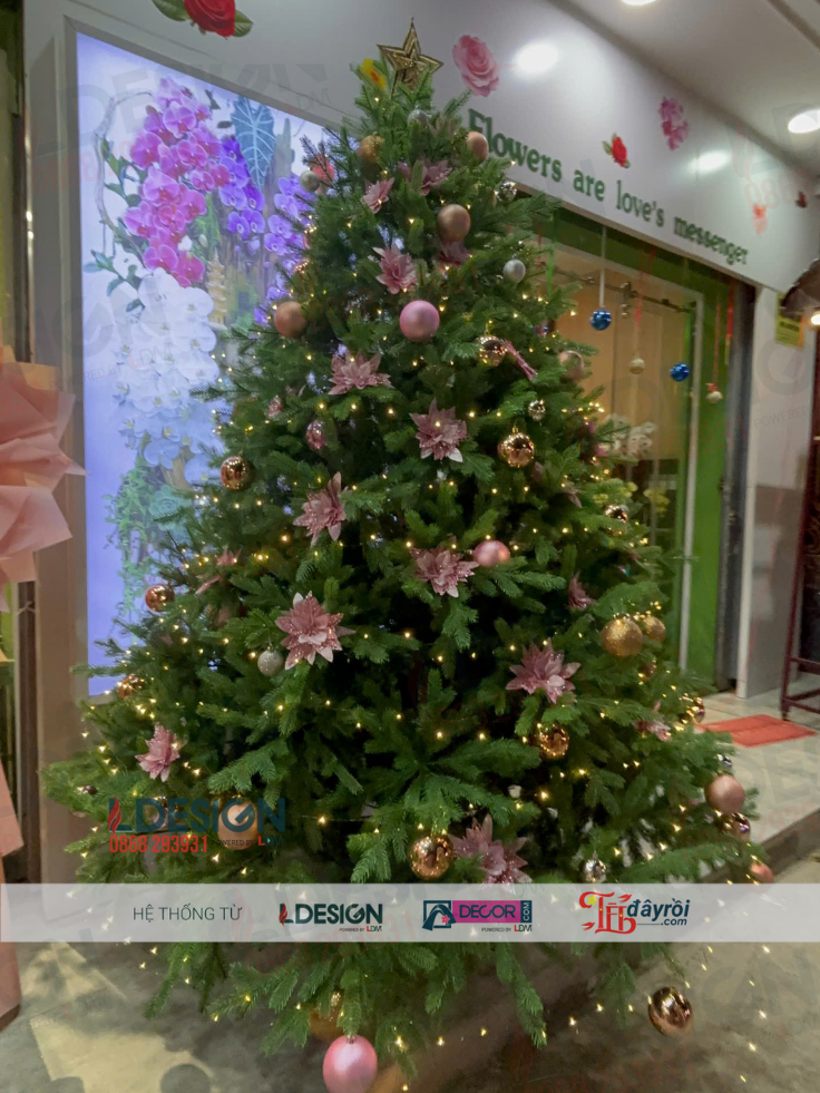 Không gian shop hoa đòi hỏi sự hài hòa về màu sắc và bố cục. Vì vậy, phương án trang trí cây thông Noel được lựa chọn kỹ lưỡng để vừa nổi bật, vừa đồng bộ với phong cách của cửa hàng.